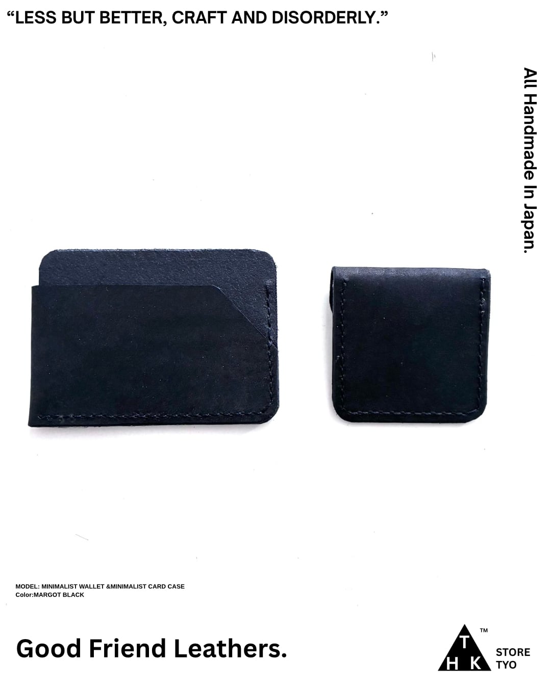 イタリアンレザー、マルゴーのブラックカラーを使用した、ミニマリストウォレット(小銭入れ)とミニマリストカードケース(カード&紙幣入れ)のセットです。
